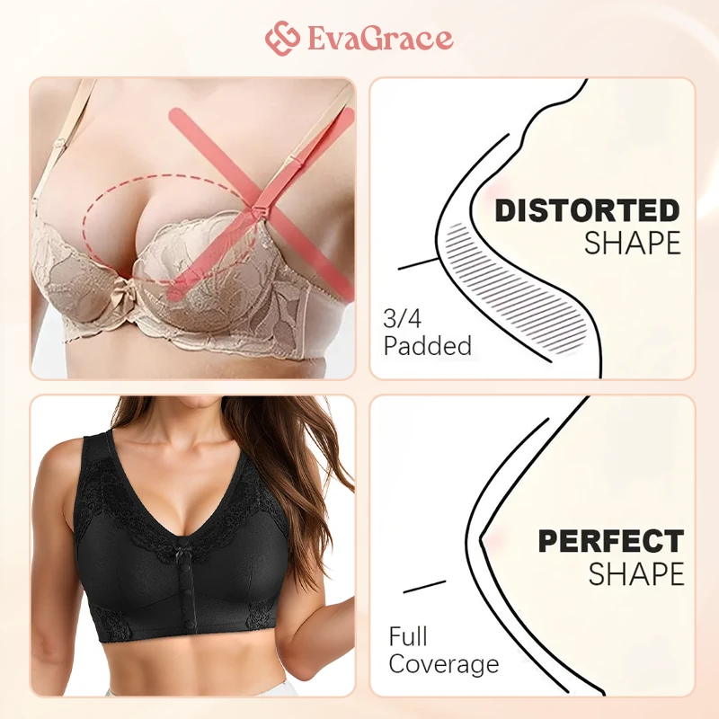 Put on and take off your bra with ease thanks to EvaGrace Bra's quick snap front button design. This can help you solve this problem, freeing your hands and eliminating the awkward position of wearing a bra.
